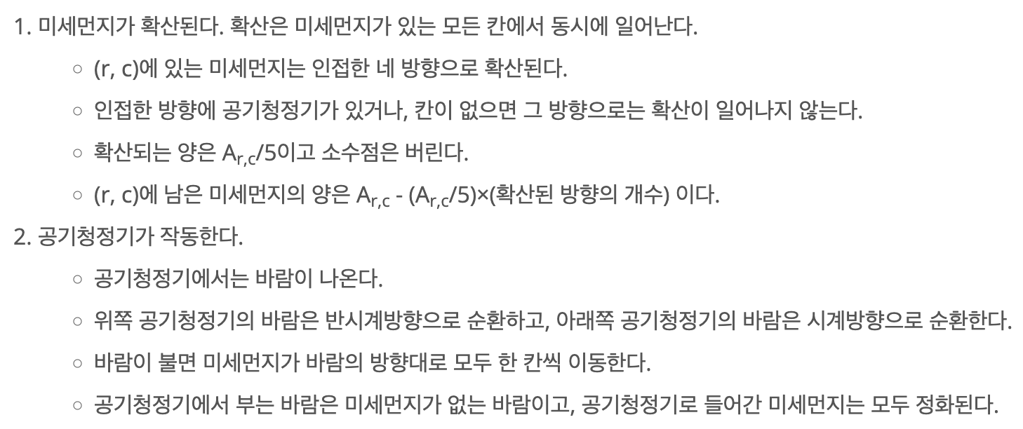 우선 문제부터 간단하게 요약하면, 방에 미세먼지와 공기 청정기가 있고, 매 1초마다 두가지 과정이 진행됩니다.