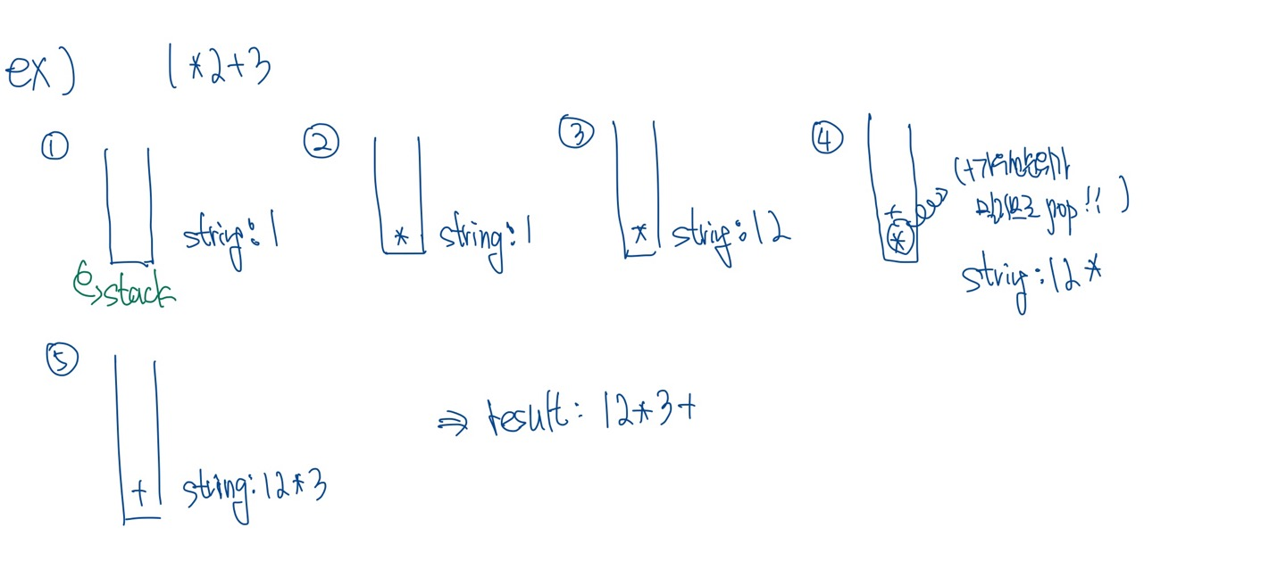 2. 연산자는 stack안에 담긴 연산자를 확인해서, 만약 본인이 우선순위가 밀리게 되면, stack안의 연산자를 본인이 안밀리는 것이 등장 할 때 까지 pop해서 string에 저장하고, 본인을 넣는다.